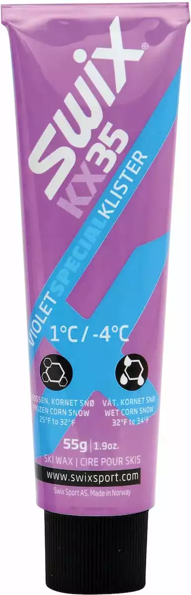 Swix KX35 Violet Special Klister er veldig godt egnet på grovkornet snø når lufttemperaturen går fra minus til pluss. Kan også brukes som mellomlag over KX20 eller KB20, før eventuelt våtsnøklister legges som topplag. Plastskrape medfølger.
