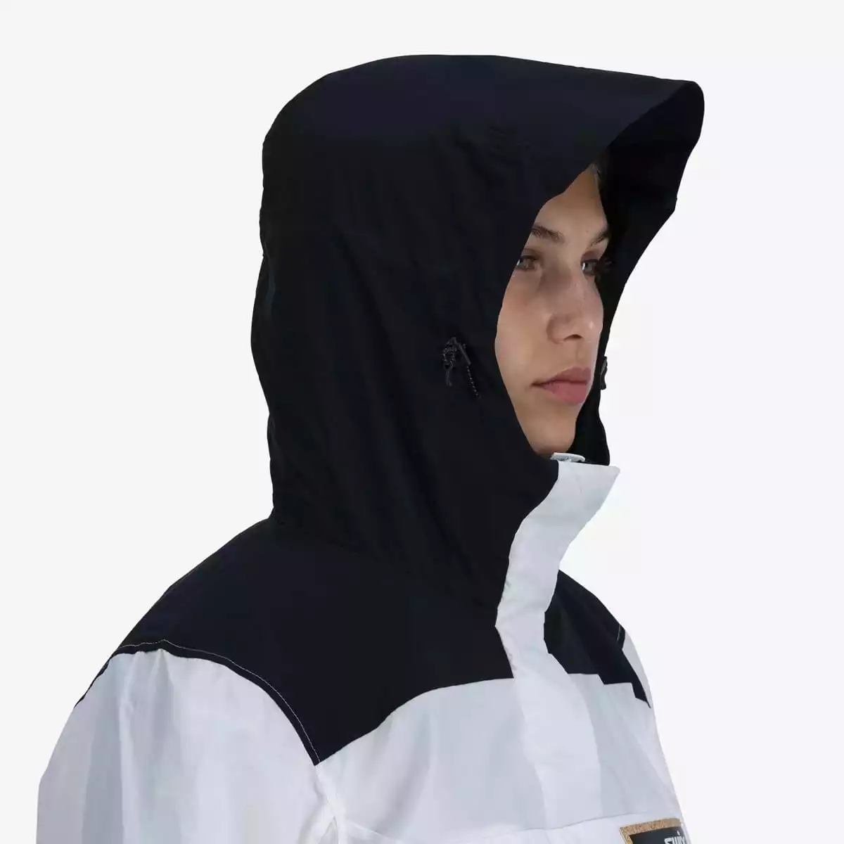 Hovedstoffet er laget av bomull med et lett PU-belegg. Anorakken har strikk i hetten og nederst. Den har en brystlomme og to håndlommer som lukkes med glidelås. Ermeåpningen kan justeres med trykknapper, og glidelåsen på venstre side kan åpnes helt.