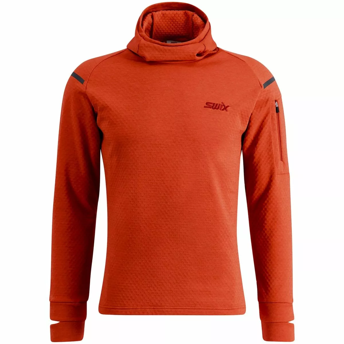Swix Pace Midlayer Hooded M er en god og varm genser til herre med 4-veis stretch. Genseren er laget av mélange jacquard-fleece med høy fuktabsorbering, som holder deg komfortabel under treningsøkten. Klokkehull på begge ermene gjør at du enkelt kan holde øye med tiden eller GPS-detaljene underveis, og lommen på øvre del av armen har plass til en telefon.
