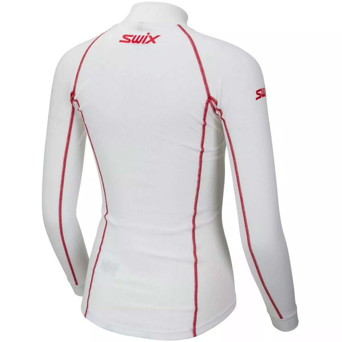 Langermet trøye med høye hals og glidelås i halsen til dame, laget i 100% polyester. Swix RaceX Bodyw er utviklet for den kresne idrettsutøveren som søker best mulig ytelse og komfort. 4-veis stretch, lav vekt, isolerende/temperaturregulerende egenskaper og fukttransporterende struktur gir høy komfort til trening.