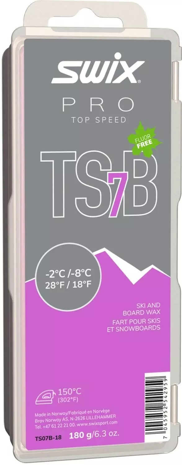 TS7B er en allsidig voks egnet for normale vinterforhold under frysepunktet. Hardheten gjør den enklere å arbeide med, og det er lett å få et godt sluttresultat. Det svarte additivet reduserer friksjonen på kald og forurenset snø. Dette er en svært populær voks i alpint og langrenn, og har vist gode egenskaper på kunstsnø i tillegg til naturlig, omdannet eldre snø. Hastigheten på smørejernet bør være ca. 8-10 sek. på en skøyte- eller alpinski. Voksen kan varmes opp på nytt etter nedkjøling til romtemperatur (10 min.) for bedre holdbarhet. Det er viktig å ha et godt smørejern for å få effektiv smelting av voksen. TS7B kan brukes som racingvoks alene, men er også ofte brukt som underlagsvoks for andre racingprodukter. Anbefalt smørejernstemp: 150°C.